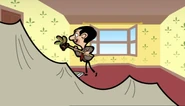After covering the furniture and appliances with tarp, Bean scrapes a small portion of the top part of the wall but can't go further due to the blunt scraper so he rips it with his hands, causing him to fall to the floor. Once the wallpapers are all removed, he gets several items from the shack , including a can of green paint. Inside his room, he smells the green paint, which smells bad. He tries to paint but he forgets the shape of the decoration so he looks for the TV but can't find it. Bean suddenly remembers he's holding the remote so he presses a button, and his TV turns on. He pauses when the screen shows the wallpaper; he notices that he can use Teddy's arm and legs to make its shape. So he ties Teddy up on a stick with both legs and one arm sticking out, dips him in the green paint and presses him on the wall to make the shape.
