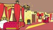 When the paint has dried, Bean uncovers his stuff before he notices the pink curtains in the poster of the Queen so he puts pink hair dye in his tub and places the curtains, two throw pillows, and seat cushion there. Next he paints the bicycle tires yellow and puts Christmas decorations on it then hanging them on the ceiling to make them resemble chandeliers. Bean then sits on the throne and wears a crown he made, making him the "queen" of the palace.