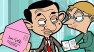Bean tries to retrieve the rude card but the postman stops him and he gets the letters. He tries to swap the rude card with Irma's birthday card but the postman stops him because no interfering with the royal mail and he puts it in the lorry. Bean tries to pursue the lorry and he stops it to let an elderly lady cross the street. When the elderly lady crosses the street, the lorry speeds off immediately, annoying Bean. Bean arrives at the post office when the postman enters the premises so Bean sneaks in when the gate opens. Bean watches the postman put the letters in the building. So he sneaks inside when the guard spots him so the guard tells him to leave. Undeterred, Bean gets a box and throws the contents inside the lorry and he rings the door and he hides inside the box. The guard answers and he sees the box on the ground so he pushes it in because Bean is heavy. An employee has placed the box on the cart and puts it in the conveyor room. Bean exits the box and he looks for his card only to realize there are thousands of letters inside the room. Bean spots the postman put the letters including the rude card on the conveyor belt. So Bean digs through the letters to get his card only to see that it's now on the conveyor belt. Bean goes to the conveyor belt and enters a spinning circle. After he exits the spinning circle, the letter goes left while Bean goes straight. So Bean runs back to get the letter but a box land on his head and a hammer pushes him to the lower level of the conveyor belt. Bean removes the box and he sees the letter on the other side so he goes there to get it only for him to fall to the chute and to a letter bag. Bean digs through the bag to look for the rude card and he gets a pink envelope only to realize it's a different pink envelope and he tears it. Bean spots the rude card but he goes up to a higher level of the conveyor belt. He opens a package containing a fishing rod and he tries to fish the letter but he fishes a spinner that pulls him closer to it. The fishing rod breaks when it touches the spinner and the conveyor belt breaks and the alarm goes off. The guard checks the room and Bean falls to the chute to the letter bag and Bean gets the rude card. Instead of tearing it immediately, Bean exits the conveyor room with the rude card still intact and the postman snatches the letter from him. The guard and the postman kick him out of the post office. A postwoman walks past Bean.