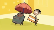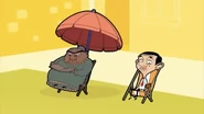 It's a warm, summer afternoon, Mrs. Wicket is resting on her deck chair whilst reading a book and Bruiser Family are in their pool relaxing. Mr. Bean comes outside too but it's too hot for him so he moves closer to Wicket but she tells him to leave because there's no more room. Bean reasons with Wicket that it's too hot to which she tells Bean to get his own shade. So Bean goes back inside and comes up with an idea of creating his own umbrella and placing his deck chair there. Bean comes out of the shack bringing out the equipment. He then digs a hole in the garden, accidentally hitting Scrapper with the mud, causing him to wake up and hiss at Bean. While Bean is digging he hits something metallic so he digs on the opposite side of the hole. While Bean is digging, Scrapper kicks the mud to his face as revenge for earlier and Bean tells him to go away; Bruiser Jr. and his sister are watching and they laugh at Bean. When Bean sees them laughing at him, he tells them to go away. Bean then sees the Bruisers relaxing on their pool. He tries to take their soda but Wicket hits him with her book and tells him to clean up the hole because she has a visitor coming.