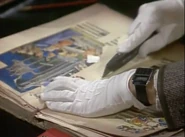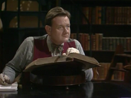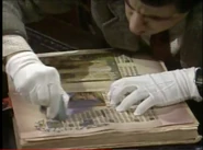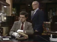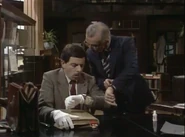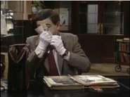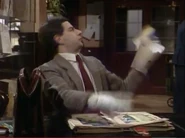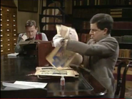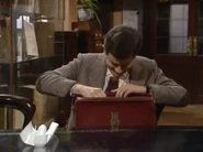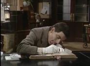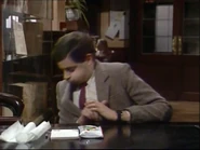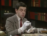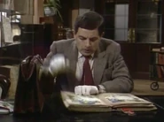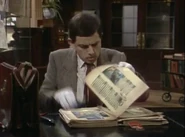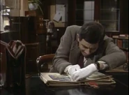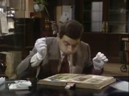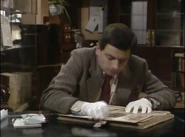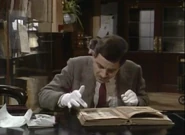 When he finally notices this, he attempts to remove the crayon marks – first by erasing, and then by using the correction fluid; while applying correction fluid, the librarian passes by and he shuts the book abruptly, smearing the wet correction fluid across the entire spread page. He attempts to tear out out the pages he has defaced. To neaten up the stubs of the pages he has torn out, he uses a box-cutter knife, but does not realise that while doing so, he destroys the book's binding spine. His final solution is to swap his book with that of someone else who is the other man at his table; this plan is working (Bean leaves, and the librarian discovers that the book the other visitor has is damaged), but then Bean returns to retrieve his Dennis the Menace and Gnasher bookmark that he forgot from his original book and is subsequently caught red-handed.