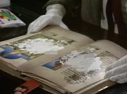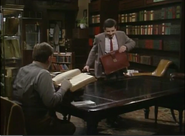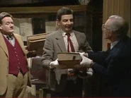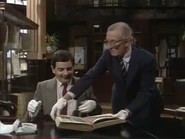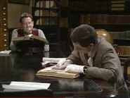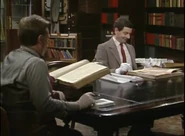 The first scene starts with Mr. Bean entering a rare book library, where he reads a rare tome that must be handled with gloves. Soon after he uses a pencil and a crayon to copy a page of the book by shading on a piece of tracing paper, he sneezes, and the tracing paper slips away. He does not notice this when he turned his head towards another man, continuing to use a crayon for shading, but on the page of the book instead of the tracing paper.