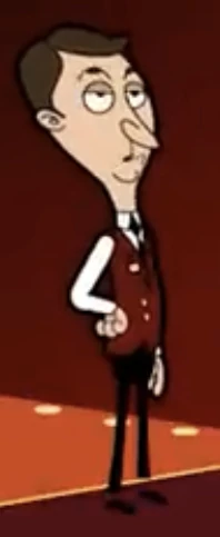 The Ticket Man has peach skin and brown neat hair. He wears a white dress shirt under a dark red vest with gold buttons, a black necktie, a gold name tag on his vest, black trousers and black shoes.