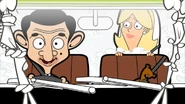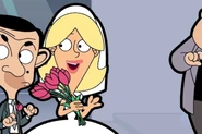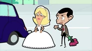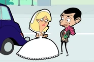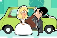 He then drives off to buy some flowers. At a flower stall, he could not afford the price. Spotting a flower bush nearby, he proceeds to take some from it. However, he is chased by a bee, causing him to get in the way of the blue three-wheeled car, in turn causing a wedding car coming from the opposite direction to crash into a mailbox. An upset bride named Regina exits the crashed wedding car and cries. Bean decides to help her. He pushes her inside his car and drives back to his home.